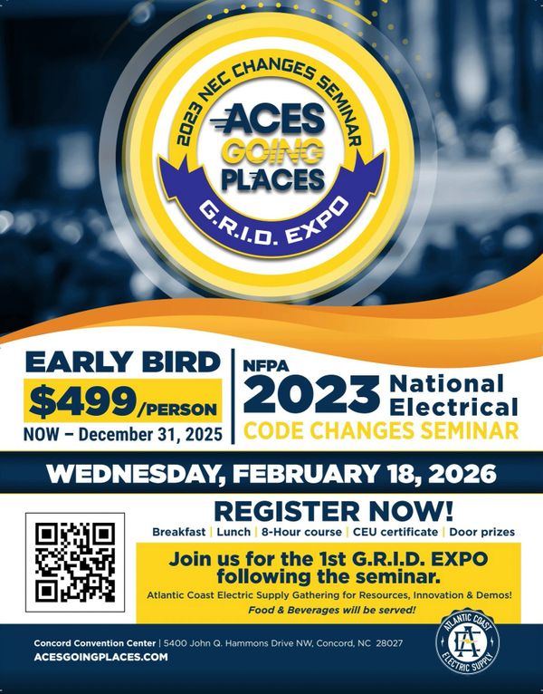 Join us for the NFPA 2023 NEC Changes Seminar featuring Brian House, industry expert instructor with Mike Holt Enterprises. This event will take place on Wednesday, February 18, 2026, at the Concord Convention Center in Concord, NC. Register now for the seminar where continuing education credits (CEUs) are available. We welcome you to join us for food, drinks, games, and door prizes at our ACES G.R.I.D. EXPO following the seminar.